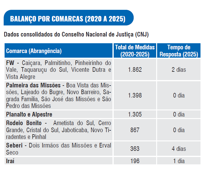 A comarca que atende Planalto e Alpestre acumulou 1.305 medidas na série histórica. Em 2025, foram 262 novos processos. Seberi registrou 85 processos em 2025 e implantou Sala das Margaridas em outubro do mesmo ano. Iraí contabilizou 66 processos em 2025. O tempo médio para concessão, que chegou a cinco dias em 2023, foi reduzido para um dia em 2025.